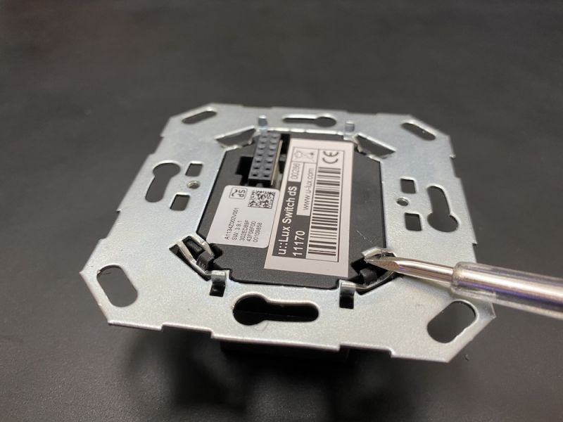 Entfernen Sie die Zinkplatte vom U::Lux Gehäuse. Biegen Sie die beiden kleinen Fixier-Stifte nach oben, danach kann das Gehäsue aus der Zinklplatte entfern werden. Dabei kann die Hersteller-Garantie verfallen.